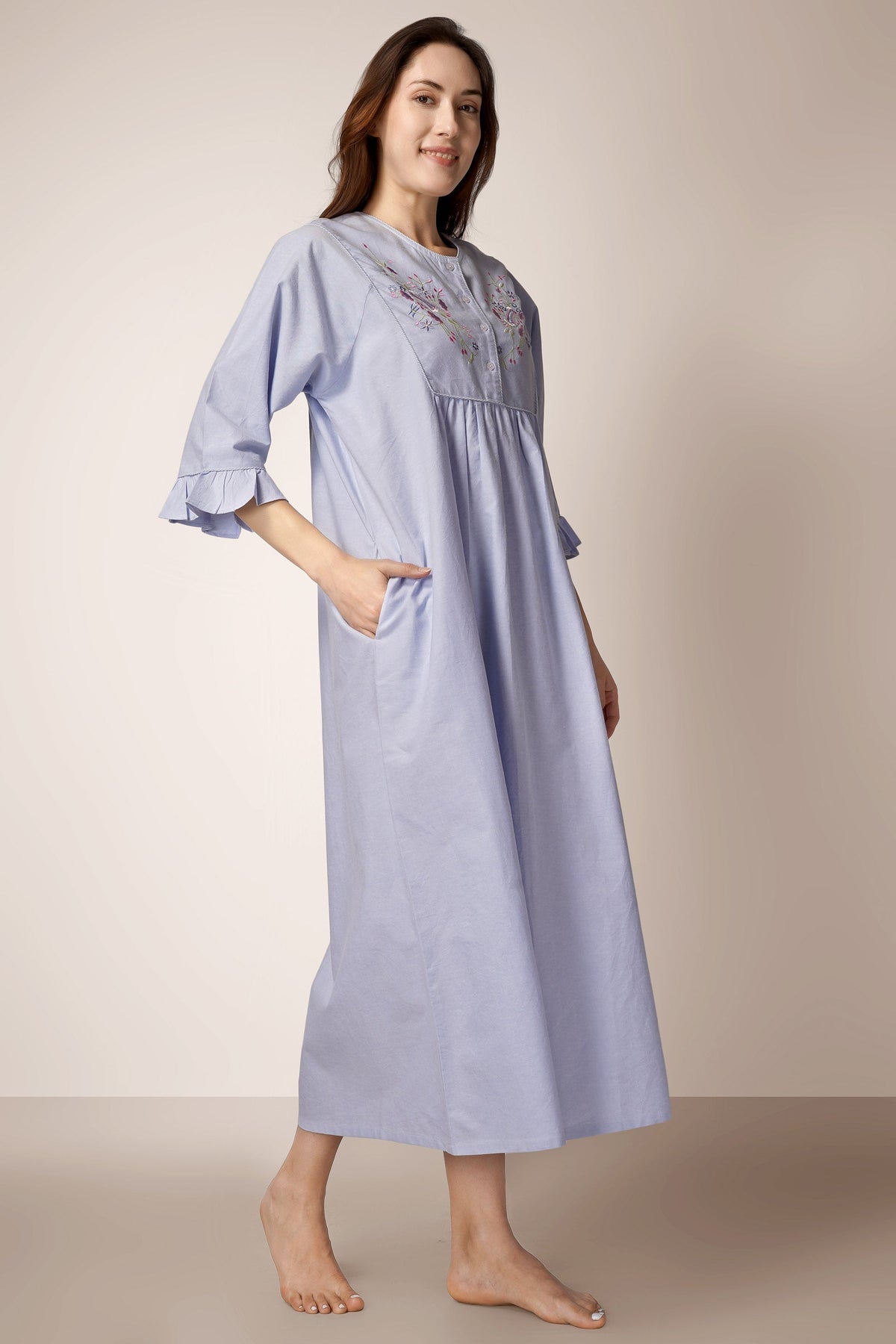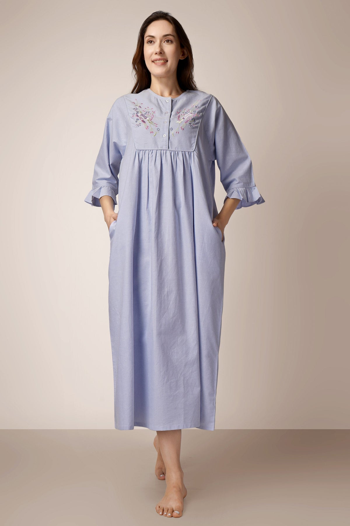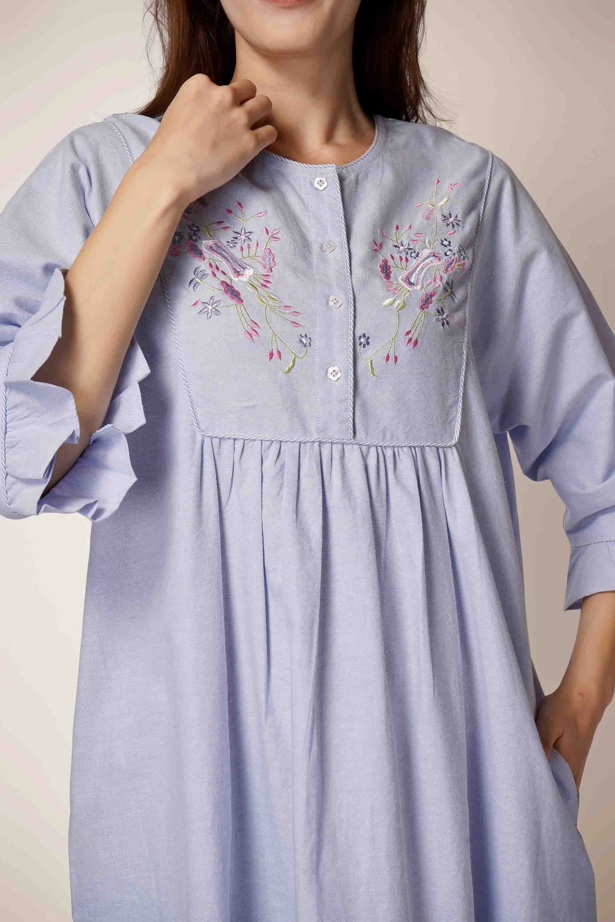 Kimberly is an oversized dress or kaftan. The pastel embroidery in pretty colours, gives an enchanting vibe to this cosy dress. Made in India, with lots of love.