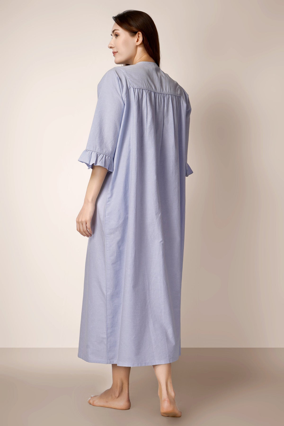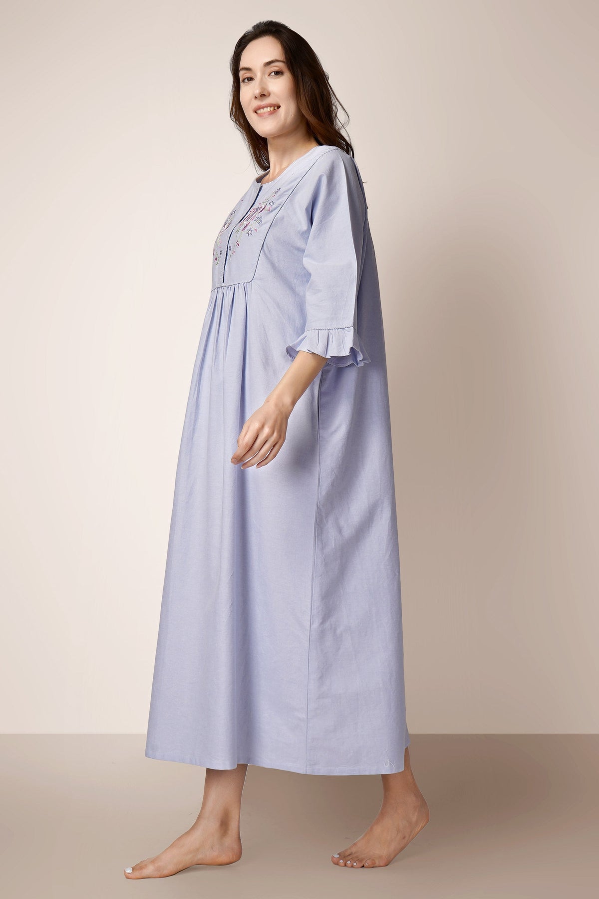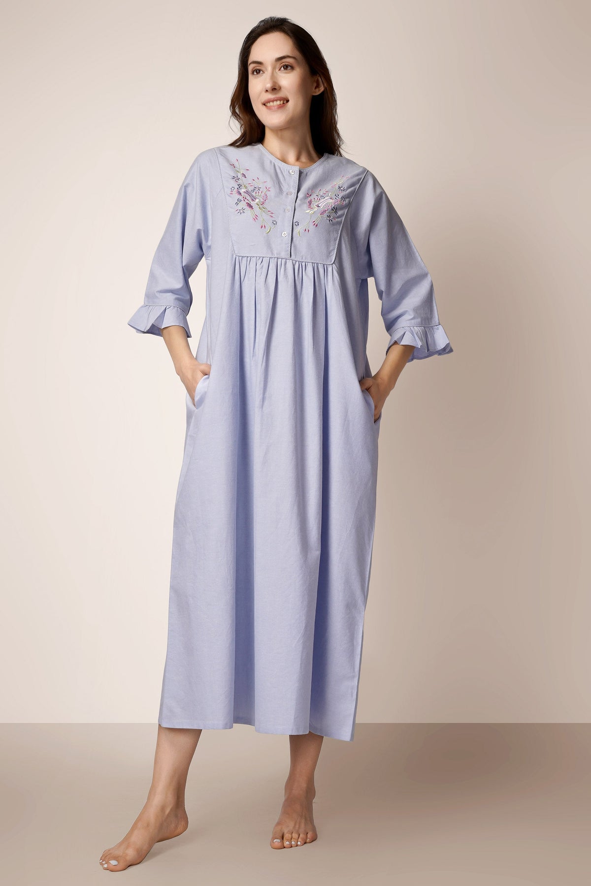 Kimberly is an oversized dress or kaftan. The pastel embroidery in pretty colours, gives an enchanting vibe to this cosy dress. Made in India, with lots of love.