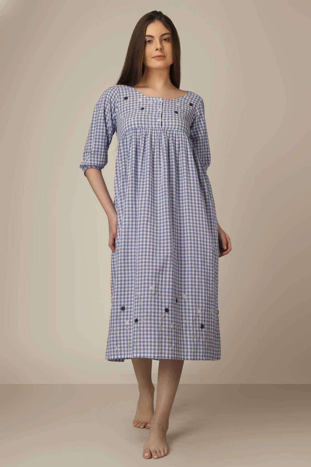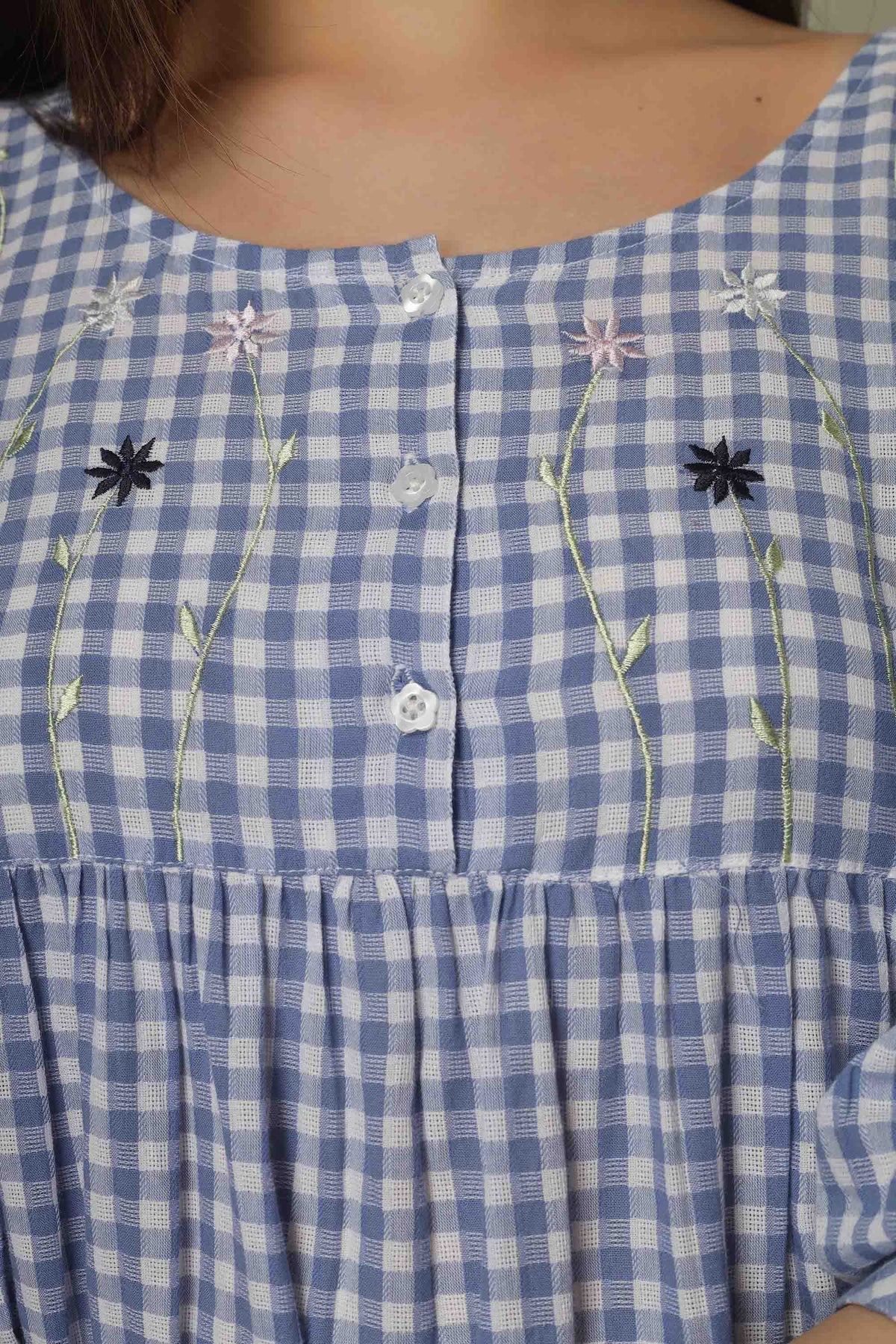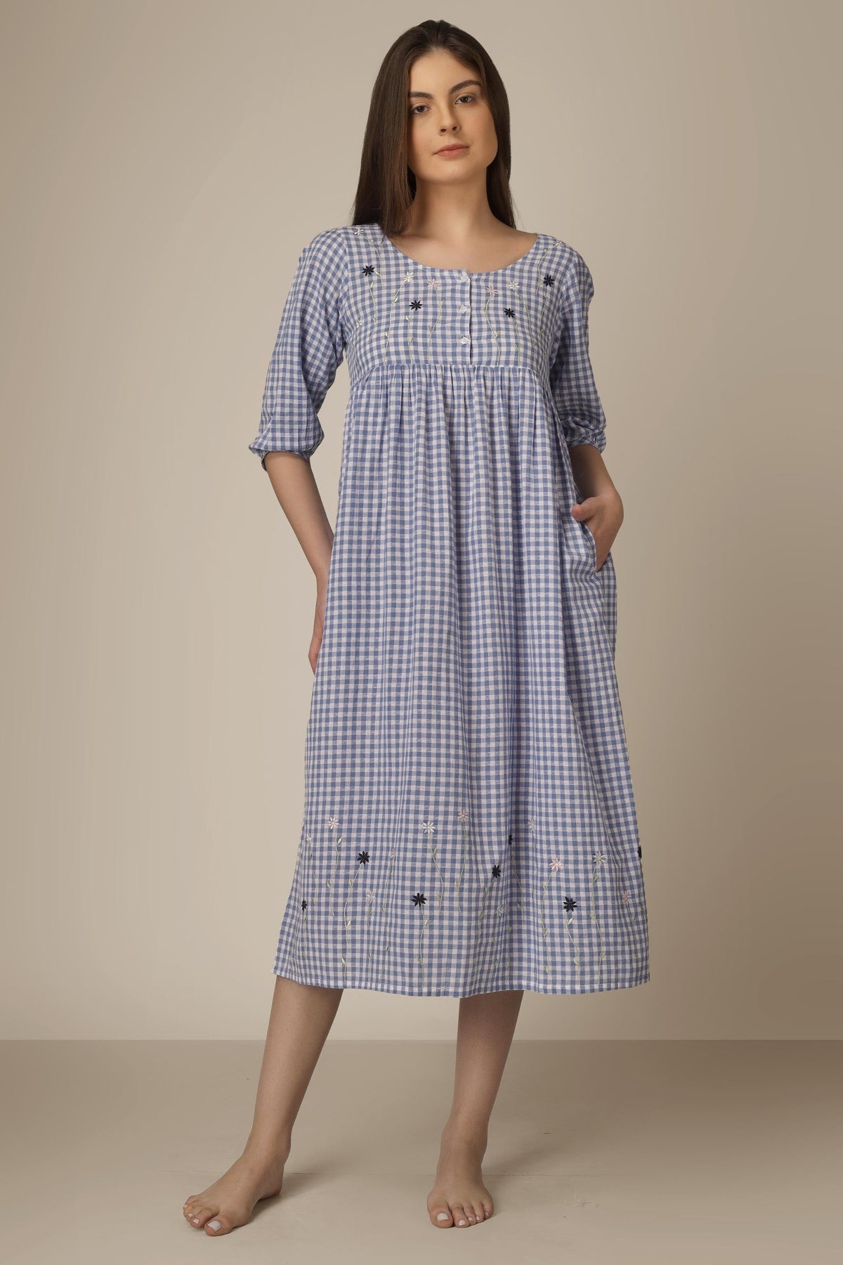 Lovely Daisy. Soft pure cotton that breathes with pretty little daisy embroidery on the bodis as well as along the hem. A comfort fit for sound sleep and a happy morning. Made in India, with lots of love.